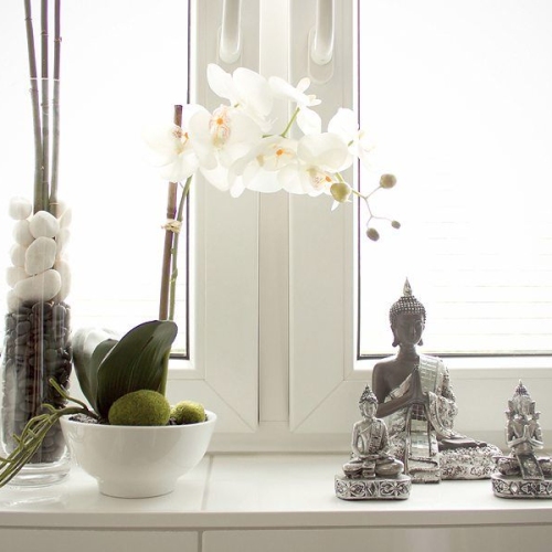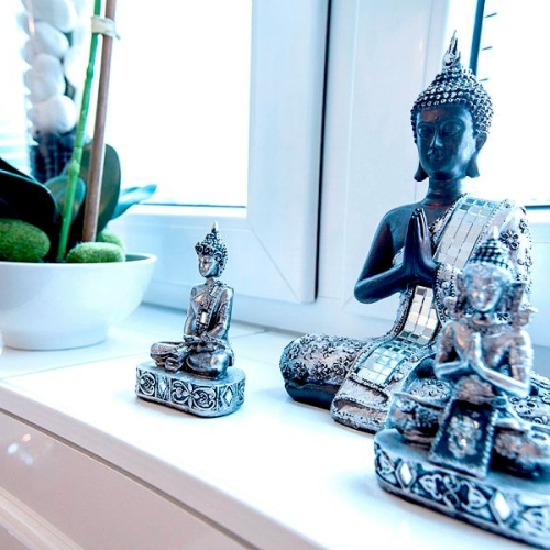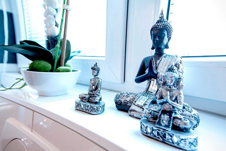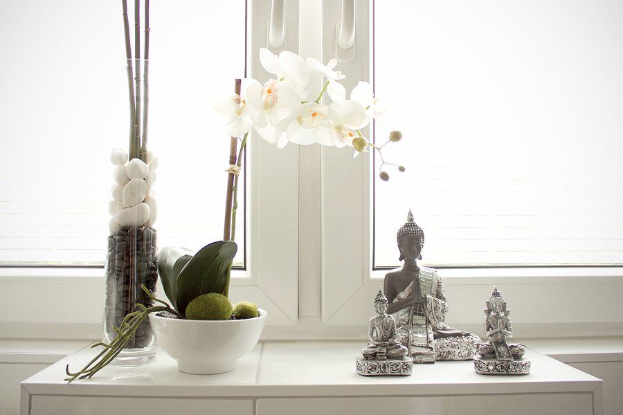 Das stilvolle grau-weiße Interieur schafft in Kombination mit edlen Materialien, geschmackvoll platzierter Dekoration und warmen Licht eine ruhige, harmonische Atmosphäre. Hier kannst du dich vor Deiner Session in aller Ruhe mental vorbereiten - oder danach wieder ganz bei Dir ankommen.