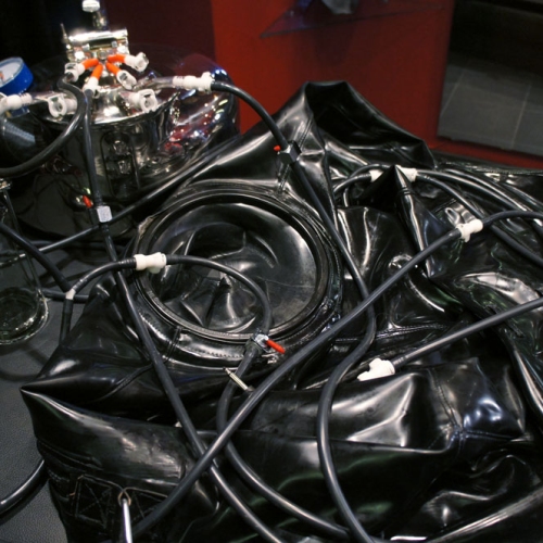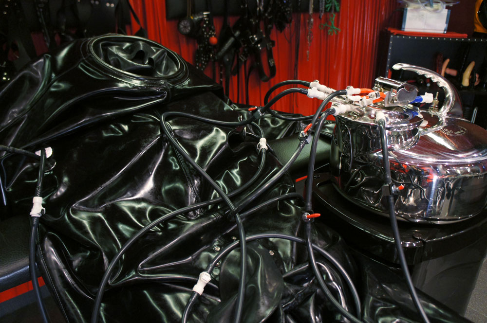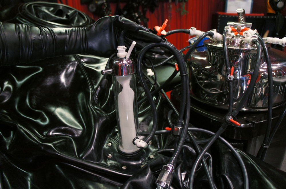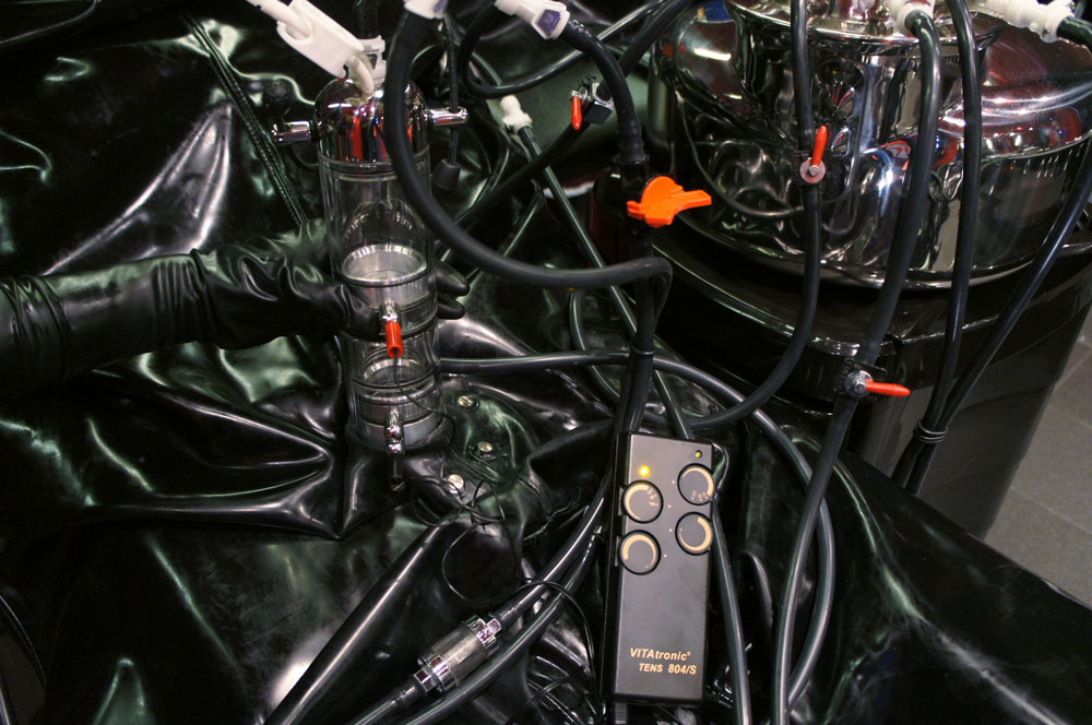 Hier erlebst Du ein unschlagbar nasses Gummi-Sauggefühl am ganzen Körper. Durch die vielen Absaugschläuche ist ein komplett luftbefreiter Latexgenuss garantiert, dieser kann durch Pulsationen noch gesteigert werden. Selbstverständlich kann das pulsieren in seiner Geschwindigkeit variieren, ganz nach Deinem Feeling. So erlebst Du ein Hightech-Latex-Bondage der Superlative.